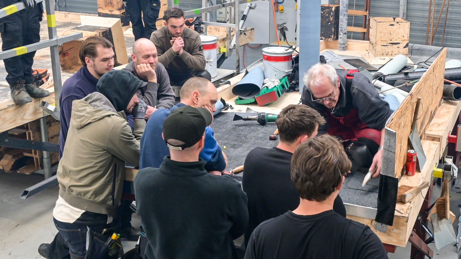 Even een moment van bezinning na een week hard werken in het praktijklokaal van TECTUM. Aan het eind van de Praktijkcursus Dakdekken voor Gevorderden neemt vakdocent John Verkaik de resultaten door met de deelnemers. De cursus is bedoeld voor de ervaren dakdekker zonder vakopleiding. Cursisten leren bijvoorbeeld werken met éénlaagse systemen, heteluchtlassen en verscheidene reparatiemethoden. Voor meer informatie, bekijk het cursusaanbod hier.